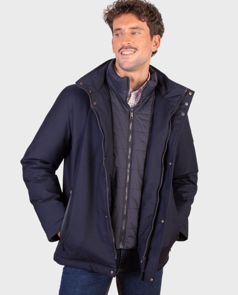 Chaqueton con doble cuello efecto chaleco interior. Acolchado interior extensible. Cremallera termosellada. Repelente al aire, agua y frío. Transpirable