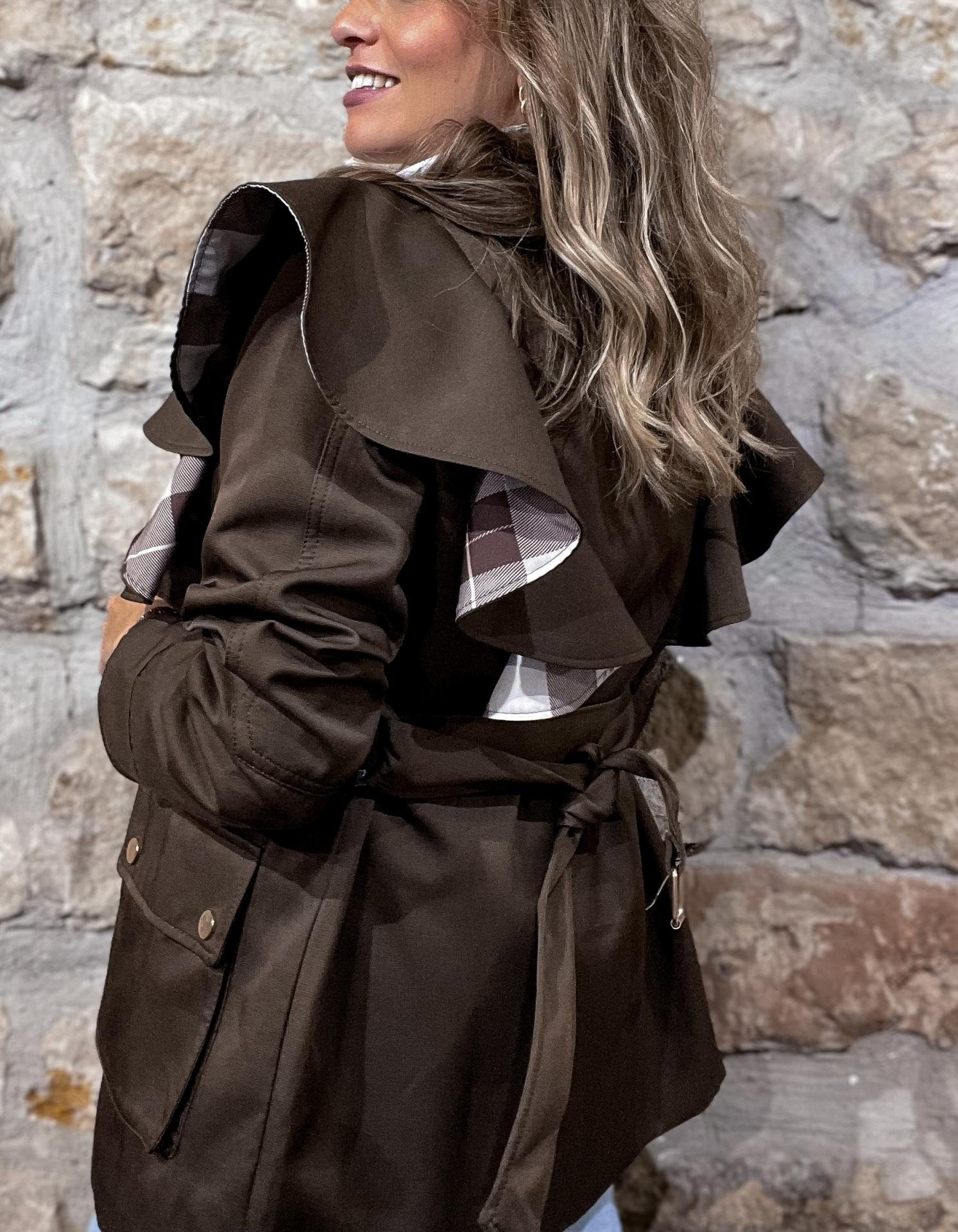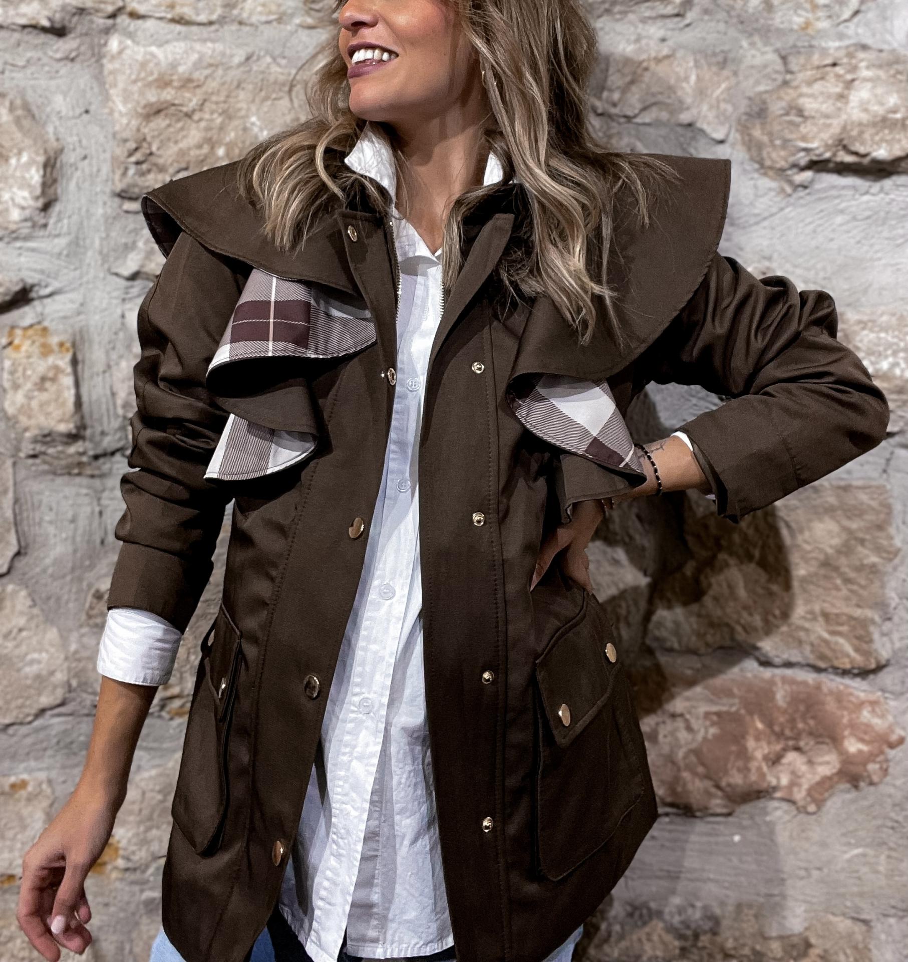 Una prenda atemporal, clásica y favorecedora. Ideal para llevarla como prenda exterior. Todos los detalles en contraste dorado. Cierre mediante cremallera y botones de click.